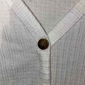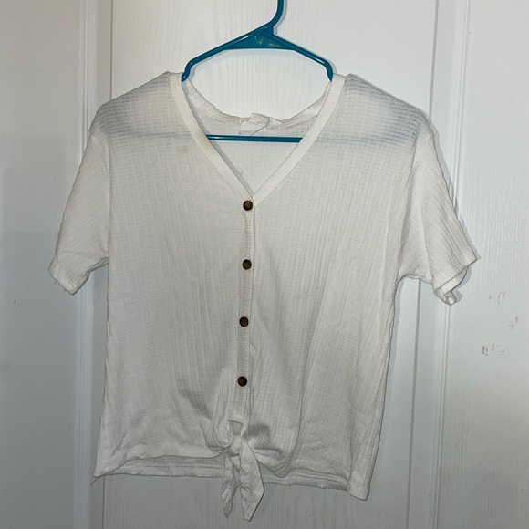 white cotton button up tee with brown buttons