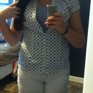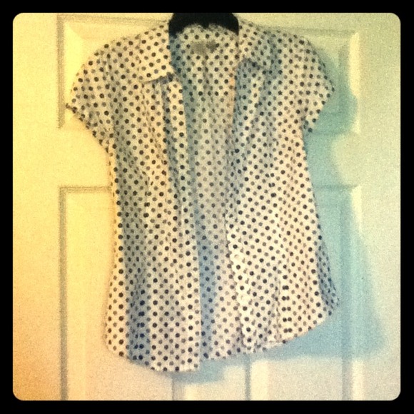 white with navy and light blue dots. button up with collar.