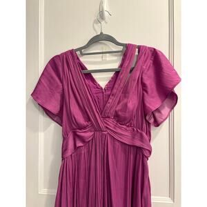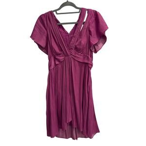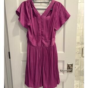 Purple mini dress from Anthropologie. It features a deep V-neck, flutter sleeves, and a fit-and-flare style with pleating details and a wrap-around design at the waist.