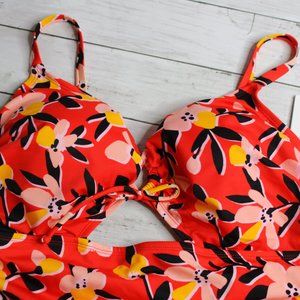 This 1 piece swimsuit has a vintage retro look to it. The top is attached to high waist swim bottoms with an open midsection. It has adjustable shoulder straps and a built in padded bra. The suit is completely lined & has a type of fabric that shapes & molds to curves. It may fit size 1X best.