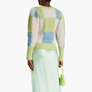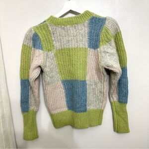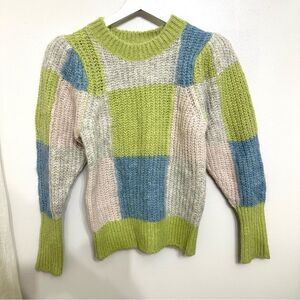 Sweater, Color-block, Ribbed-knit, Shoulder pads, Slips on, Heavy-weight knit.