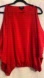 Elegant red blouse with open shoulders. Flowy and chic design. Ideal for casual or dressy occasions. Elastic waist.