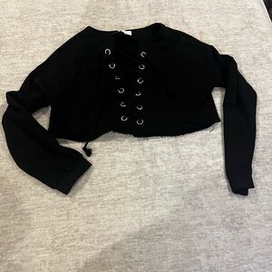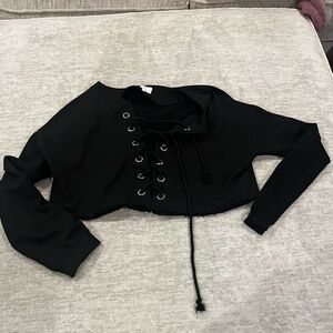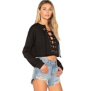 Awesome black sweatshirt size L. Sold out. Purchased from revolve.Comfortable with a sexy twist on the front. Classic black color, right in style with the comfortable yet stylish trend. Dress this up or down for occasion. Great condition. Open to all fair offers, go ahead and make one!65% cotton, 35% poly. Hand wash cold. Lace-up front with tie closure. Cuffed sleeves. Raw cut hem. Revolve Style No. BTWR-WK7. Manufacturer Style No. BTOU406 U17.