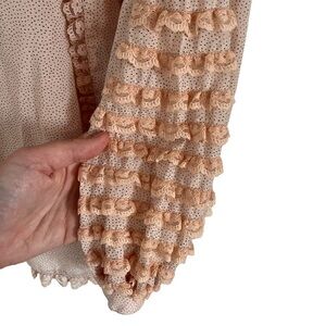 byTIMO Coquette Polka Dot Lace Ruffle Tie Neck Blouse. Blush pink with micro polka dots throughout. Brand sold on REVOLVE. Ruffle lace sleeve detail with faux pearl buttons. Tie neck with same ruffle detail. Slightly sheer. Boxy, oversized fit. All photos except model picture are of the actual top for sale.