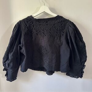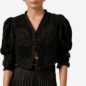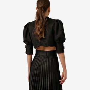 The top has a v-neck and short, puffed sleeves. The tight cuffs are decorated with buttons and delicate ruffles on the edge. The top closes at the front with hooks.