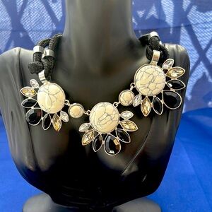 Vintage circa 1980s Crystal Onyx & Stone Chunky Pendant Silver-tone Corded Statement 18”