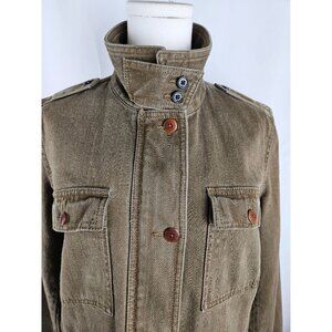 Elevate your wardrobe with this vintage military-style jacket by Lauren Jeans Co. Crafted from durable cotton, this jacket offers practicality and style. It features four large patch pockets and a versatile collar that can transform into a stand-up style. Perfect for those who appreciate timeless fashion with functional elements. Color is green olive..brownish.