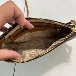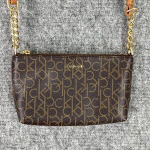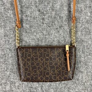Keywords: Calvin Klein, crossbody bag, brown purse, logo print, chain strap, shoulder bag, designer bag, women's fashion, small bag, zip top, gold tone, adjustable strap, CK bag, mini bag