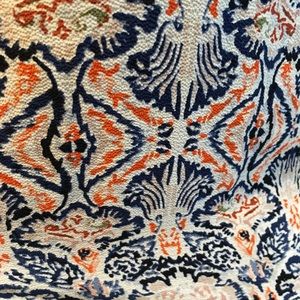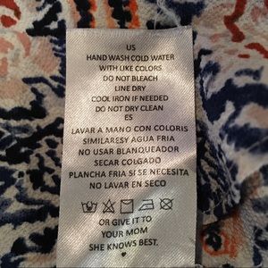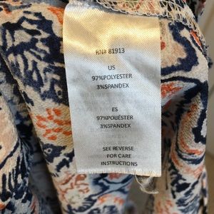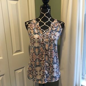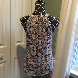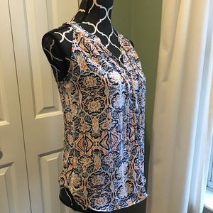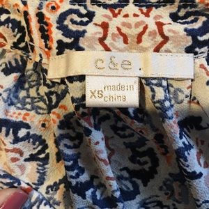 c & e sleeveless top. Size: XS Color: cream with blue and orange design. Tie at neckline. 97% polyester (6)