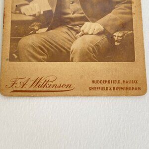 Circa 1870 Antique CDV Light Eyed Man in a Fancy Suit, Vest and Bowtie Portrait Carte De Visite Photo Mounted on a Stiff Paper Cardstock Backing. F.A. Wilkinson Photographic Fine Art Studios, Byram Arcade, Huddersfield; 12 Grossley St, Halifax; 20 Fitz William St, Sheffield and at Birmingham. The back of the card has a nice printed design.