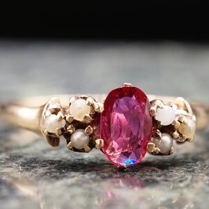 c.1880 Victorian Engagement Ring .52ct 6.5x4mm Natural Ruby Seed Pearls 14k
