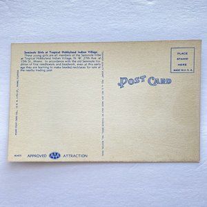 1930 - 1945 Seminole Indian Children Girls Beading Necklaces at Tropical Hobbyland in Miami, FL Linen Postcard. The Back has "Approved AAA Attraction". New Old Stock.