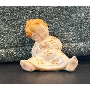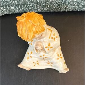 Vintage figurine of a sleepy child dating back to 1956. The figurine is primarily cream-colored with orange floral patterns on its clothing and orange hair. It is about 2 inches high and wide. Would make an adorable shelf sitter.