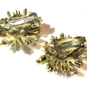 These are c1960 signed Coro Clip earrings from the Modernist period. The earrings are shaped as a wreath of “twisted ribbons”, juxtaposing shiny and matte textures. The earrings measure 1 1/8” tall and are gold plated. The backs are signed “Coro” in script. Very good vintage condition.