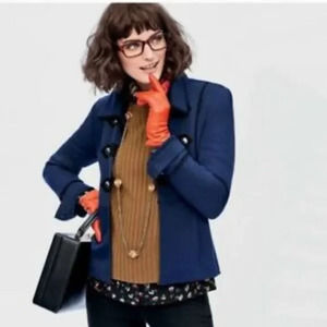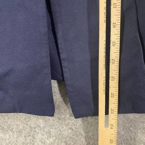 Features: navy blue ponte knit jacket, collared, button detailing at the front, hook closures at the front, long sleeves with button detailing, shoulder pads