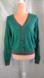 Super soft, all cotton, knit cardigan. Heather green, with green polka dots & grey trimming. V neckline, with full button up front. Long sleeves. Grey ribbed cuffs. Stretchy.