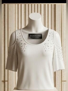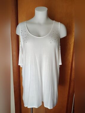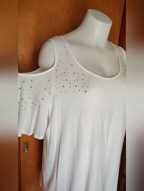 Stun in this high-end, versatile piece that effortlessly transitions from a sophisticated tunic to a flirty mini-dress. This crisp white garment features a bold cold-shoulder cut and is heavily embellished with premium rhinestone crystals that offer a brilliant, "bougie" sparkle. The elongated length provides elegant coverage and a flowy, upscale silhouette that is perfect for any boutique-style wardrobe.