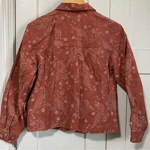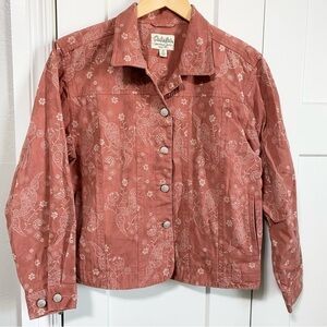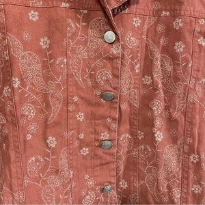 Cabela’s dusty rose jean jacket with cream colored paisley floral design. The color is a dusty rose. Style is trucker jacket jean heavy. size Medium