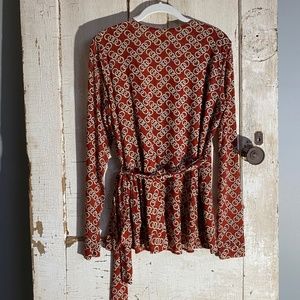 New - never worn - no tag. Signet print. Fitted true wrap top. 2 layers soft mesh knit on body, one on sleeves. Long sleeved. SOFT mesh knit with tie. So comfy!!! Wow your guests this Holiday!