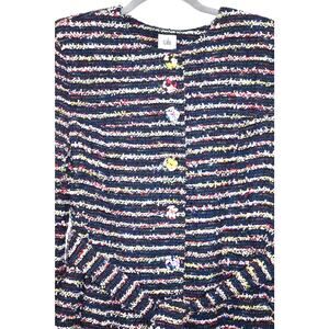 Floral lined, navy jacket with stripes, tweed material, floral buttons, tie waist, built-in shoulder pads for structure, 3-button closure at wrists of sleeves, knee length