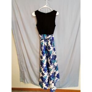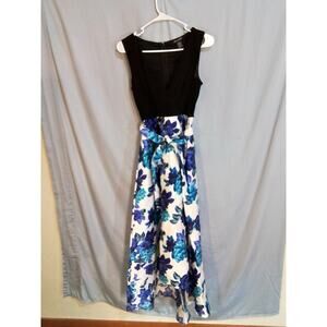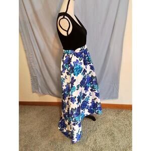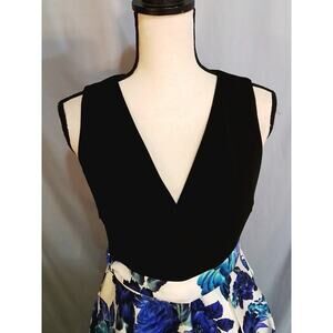 Candalite dress. Black bodice with blue floral on white background skirt.