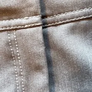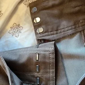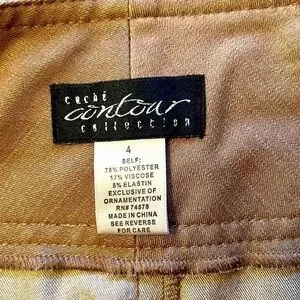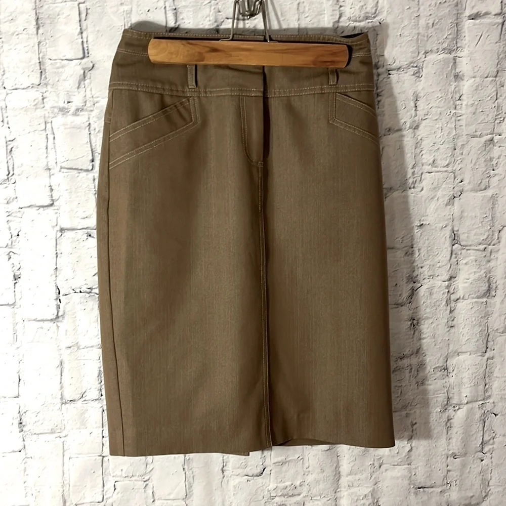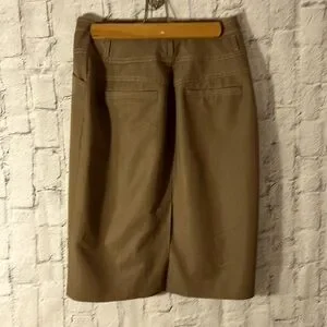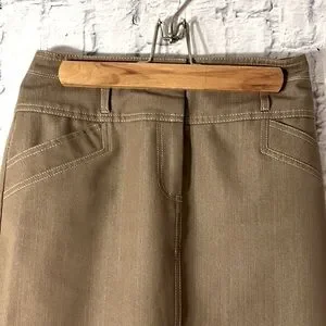 This khaki skirt would be a versatile addition to any closet. It has a waistband of approximately 3.5 “ long with 5 belt loops. There are two false pockets in the front and two in the back. The skirt closes with a 4”zipper and 3 hook and eye closures. There is a 4” vent extension on the back for easy walking. The skirt is unlined, however no light shines through when held up to a window. Waistband measures approximately 28” and length of skirt is 23”. The fabric color differs in the photos, but photo #1and 4 are very close to the actual color. Skirt is hand wash cold and line dry. This skirt is in very condition and comes from a smoke free environment.
