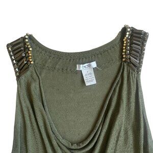 classic early-mid 2000s cache scoop neckline with stylish dark gold beaded  trim along the back of the neckline. army green / khaki soft fabric with rolled style hemline.