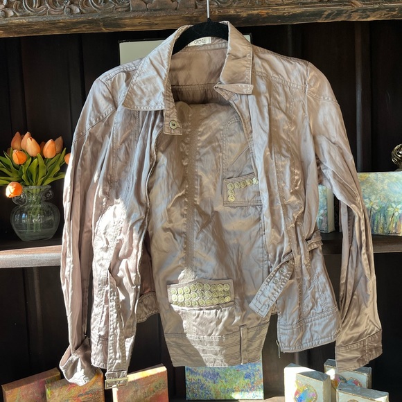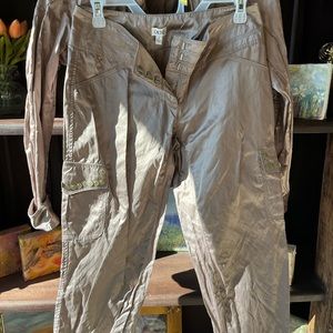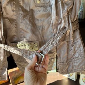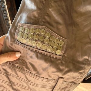 cache satin set size 2 never worn. the jacket is belted and the pants have cargo pockets with coin detailing