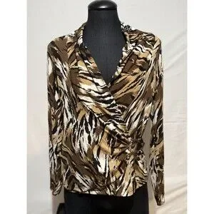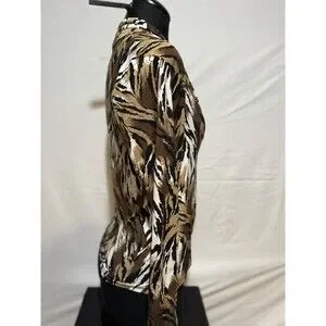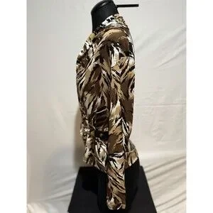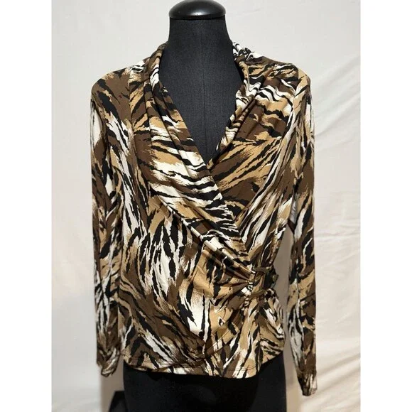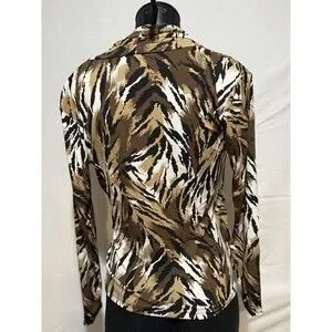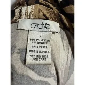The Cache top is a stylish blouse featuring a cowl neck and long sleeves, perfect for a casual occasion. Made from a blend of polyester and spandex, this top offers a comfortable fit with a touch of stretch. The animal print pattern and 90s theme add a trendy touch to this vintage piece, making it a versatile addition to your wardrobe. Perfect for the summer, fall, and spring seasons, this top by Cache is a must-have for any fashion-forward woman.