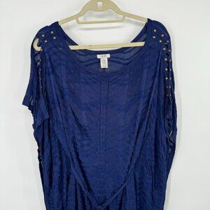 A blue, large-size poncho sweater by Cache that's embellished for a stylish look. It has a tie front design and is made with a comfortable rayon/cotton blend.