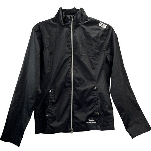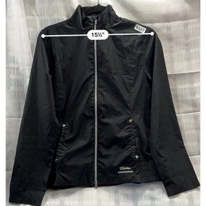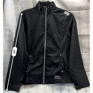 This Callaway jacket, perfect for both men and women, comes in a sleek black color and size S. It is made entirely of polyester for durability and comfort.