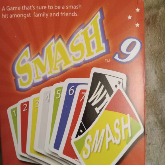 smash 9 new card game red with yellow font, new.