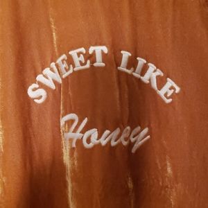 Gold color cardigan. 70s inspired. Cute Logan on the back "sweet like honey"