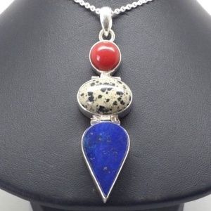 Long Carnelian Dalmation Jasper Lapis Design Sterling Silver 925 Necklace 25g! 22" 925 sterling silver chain included in the price.