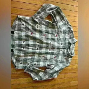 casey and max Button Shirt Blouse Women’s Large Plaid Sparkly Embroidered Santa snow flake Christmas