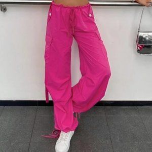 casual Flap Pocket Drawstring Hem cargo Pants Hot pink