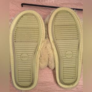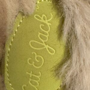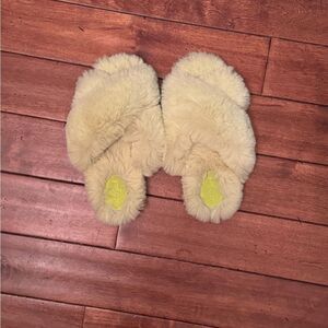 These are pre-owned girls' house slippers from the brand Cat & Jack. They are yellow in color and have a slip-on style with faux fur upper material. The model is called "cat" and they are sized M (2/3) in US shoe size.