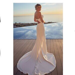Turn up the appeal on your wedding day in LE106 Mathilde. Posh and timeless, this modern wedding dress is created with the minimal bride in mind. A draping neckline is unique and lavishly romantic, supported by simple spaghetti straps, while the back of the gown opens up to show off the lower back. Soft stretch georgette makes up the entire fit-and-flare silhouette on this stunner, making way for a slit in the front to show a little leg, before cascading into a splendidly simple 76 inch train. Comfortable and stylish, this gown is a timeless choice for your wedding day.