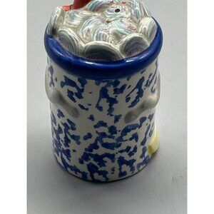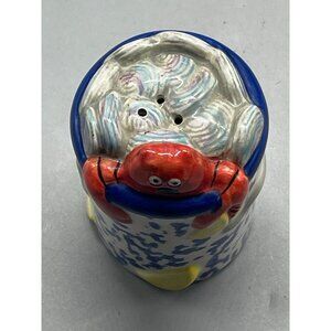 This gently used ceramic salt shaker features a charming blue design with lemons, an orange crab on top, gray waves, and a dark blue rim. It's perfect for adding a splash of color to your kitchen.
