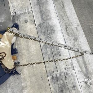 Chambray linen & cotton blend apron w/ floral, ribbon and pearl accents. Adjustable waist (81” total) & neck chain (26” total). One pocket. Bee 🐝 charm.