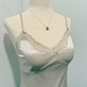 ⟡ Quality: excellent condition • silky satin bodice with delicate lace along the neckline + hem • tiny bow detail at bust • lightweight + slightly stretchy • semi-sheer in bright light • perfect for coquette, dollette, balletcore, romantic softgirl looks, or layering with cardigans + shrugs