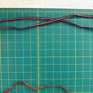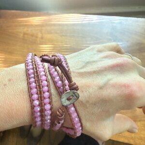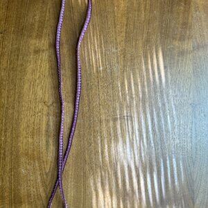 roughly 31 inches, can be wrapped as bracelet, worn a necklace, and belt if fits. I think the stone is quartz, handmade, sterling button, very boho.