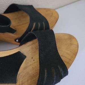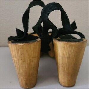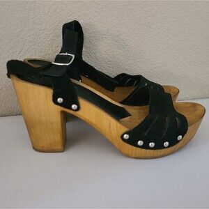 These sandals are in good condition. The suede is very soft and comfortable to wear, and there are buckles on the ankle straps to pick your best fit. The heels are 3 3/4" high, offset with a 1 1/2" platform, so they don't feel that high when worn. They show light signs of wear.