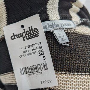 Add a pop of color to your winter or fall wardrobe with this Charlotte Russe women's cardigan. The black and white striped pattern and colorful theme make it perfect for travel, casual outings, workwear, or business meetings. The long-sleeved, relaxed fit sweater is made of machine washable cotton material in a knit fabric type. The size S cardigan is a regular fit and has no vintage or personalized features. It is categorized under women's clothing, sweaters, and department, making it a versatile addition to any wardrobe. Elevate your style with this statement piece without worrying about the condition.