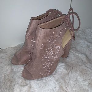 blush pink faux suede open toe booties from charlotte russe. tie behind ankle. women’s size 7 (US). never worn outside, soles are flawless.
