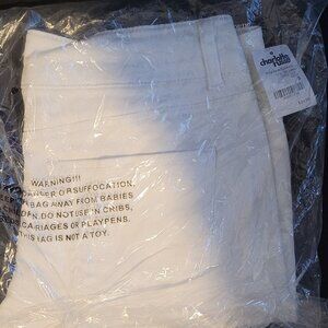 These white, multi-button shorts (2 buttons, not 5, with a classic zipper) have a distressed hem and multiple pockets. In the original plastic bag it came in, no stains.