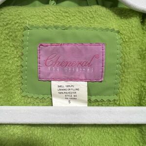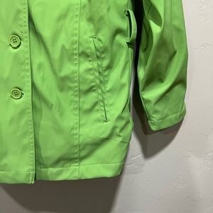 Green color rain jacket with fleece lining, matching Greet buttons, fleece hood, with side pockets