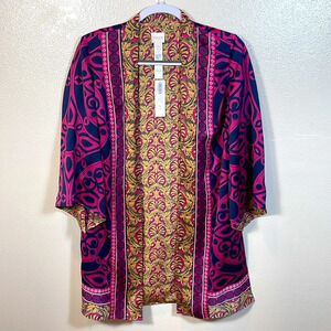 Fact 1: This bold, outfit-making kimono gets noticed. Fact 2: It's reversible, so you can switch from one gorgeous print to the other in an instant.