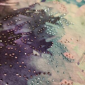 This beautiful Chico's top features a delicate blue floral pattern with lace sleeves. The fabric type is lace, which adds a touch of elegance to the top. It's perfect for any occasion and can be paired with jeans or a skirt. The top is designed for women and is available in Chico's size 1, which is equivalent to a medium. The top is in excellent condition and is ready to be added to your wardrobe.