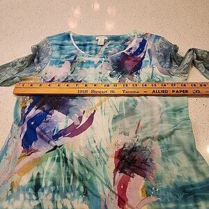 chicos size 1 M Blue Floral Shirt Top Lace Sleeves